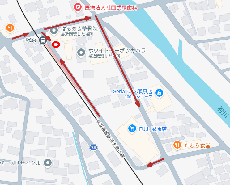 大雄山線沿いの県道74号線から塚原駅入り口を曲がり、踏切を越えてすぐに右折。